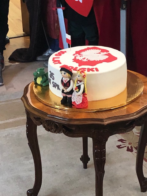 Całość zakończyła się przygotowanym przez rodziców poczęstunkiem, pośród którego znalazł się ogromny tort przyozdobiony narodowymi emblematami. Tenże kulinarny zestaw pozwolił nam na skrzydłach kubków smakowych przenieść się na chwilę w okolice rodzimych stron.
